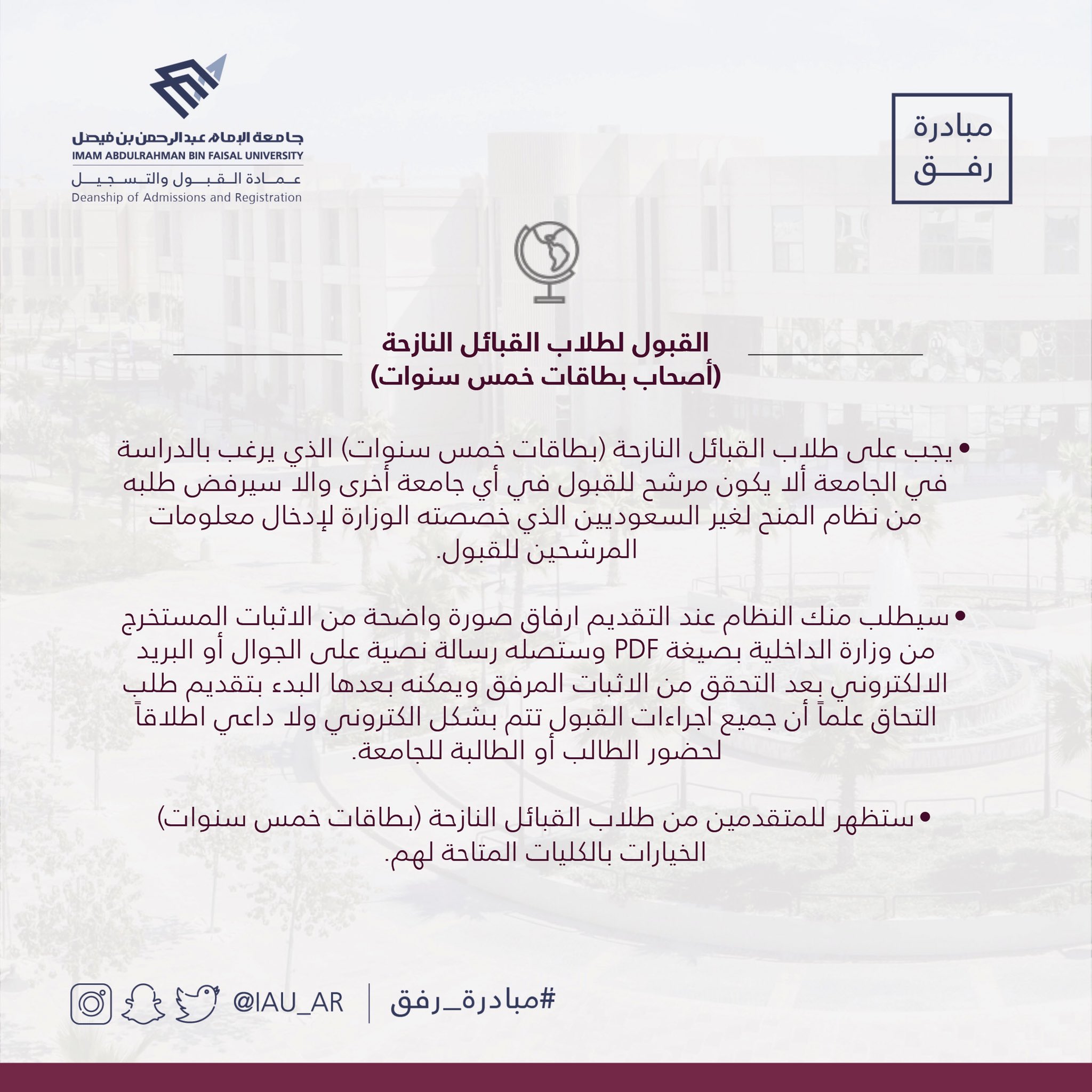 عمادة القبول والتسجيل A Twitter شروط وضوابط القبول لغير السعوديين أو طلاب القبائل النازحة في جامعة الإمام عبدالرحمن بن فيصل مبادرة رفق